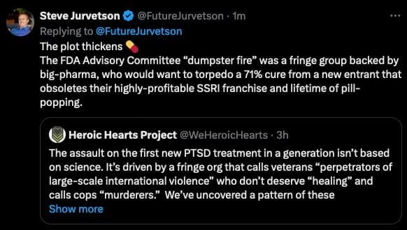 Rather than acknowledging the legitimate challenges faced by Lykos Therapeutics, Jurvetson has helped frame the issue as a political battle against “radical leftists” who she falsely claims oppose treatments for veterans. She has increasingly appealed directly to the Trump administration to overturn the FDA’s rejection throughout 2025.