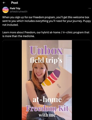 This might sound extreme to some people, but I think it’s incredibly toxic. Marketing is all about behavioral economics, right? You’re trying to get someone’s attention and keep it. The one that really got under my skin was this Field Trip advertisement, where they do the unboxing of Field Trip’s at-home ketamine kit, and they had a cute white girl, young with a beanie. She’s so stoked to get her box, and she’s doing an unboxing video.