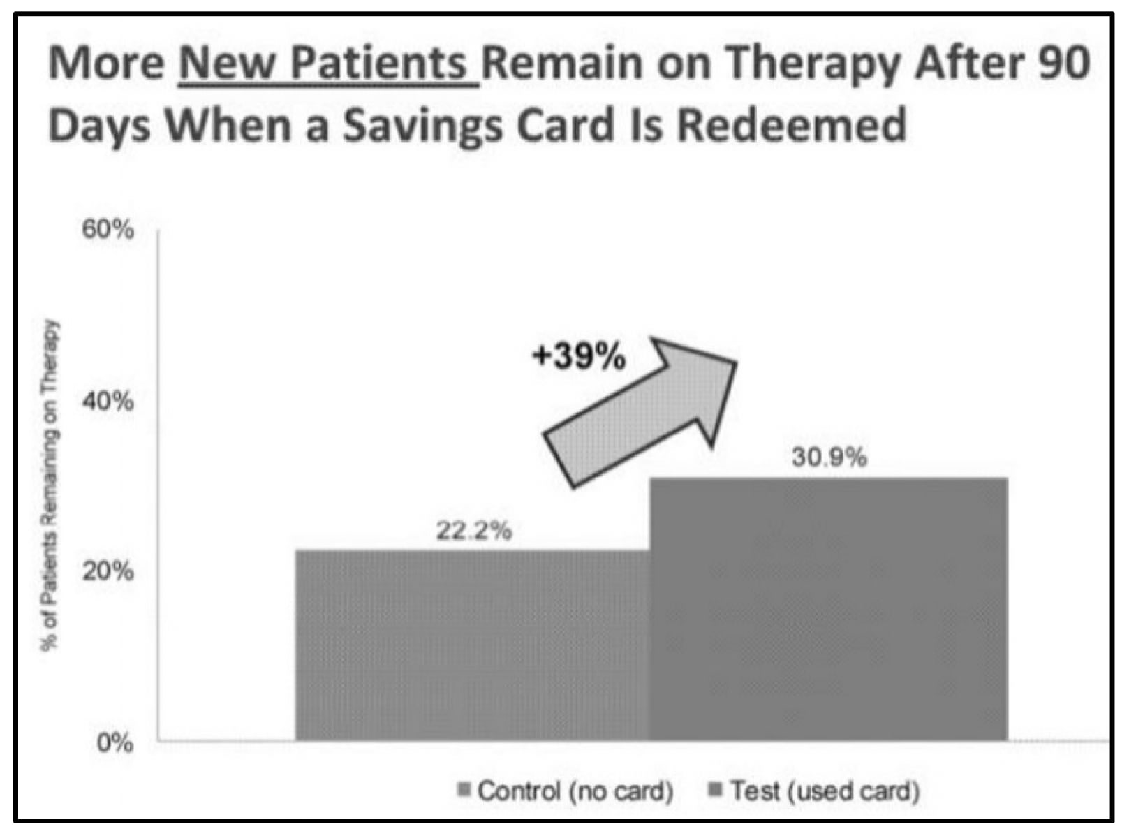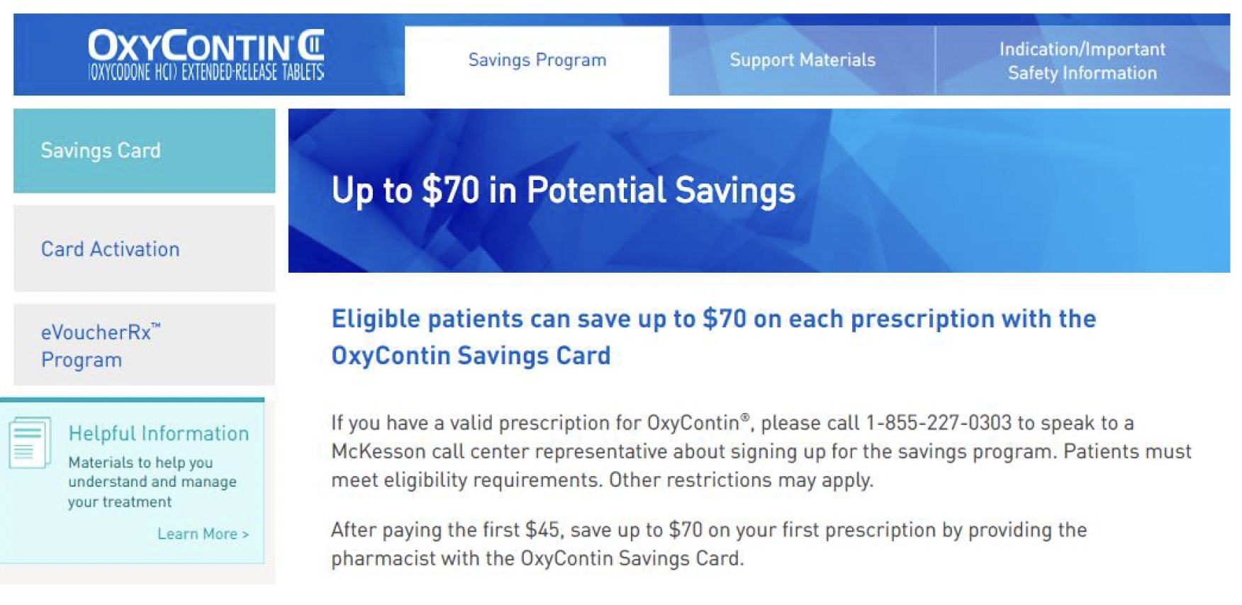Purdue’s internal analysis showed these had a phenomenal return on investment: Every $1 million spent on OxyContin savings cards translated into $4.28 million in revenue. The savings cards “helped” patients afford opioid therapy — with the result that many would end up trapped on opioids long term.