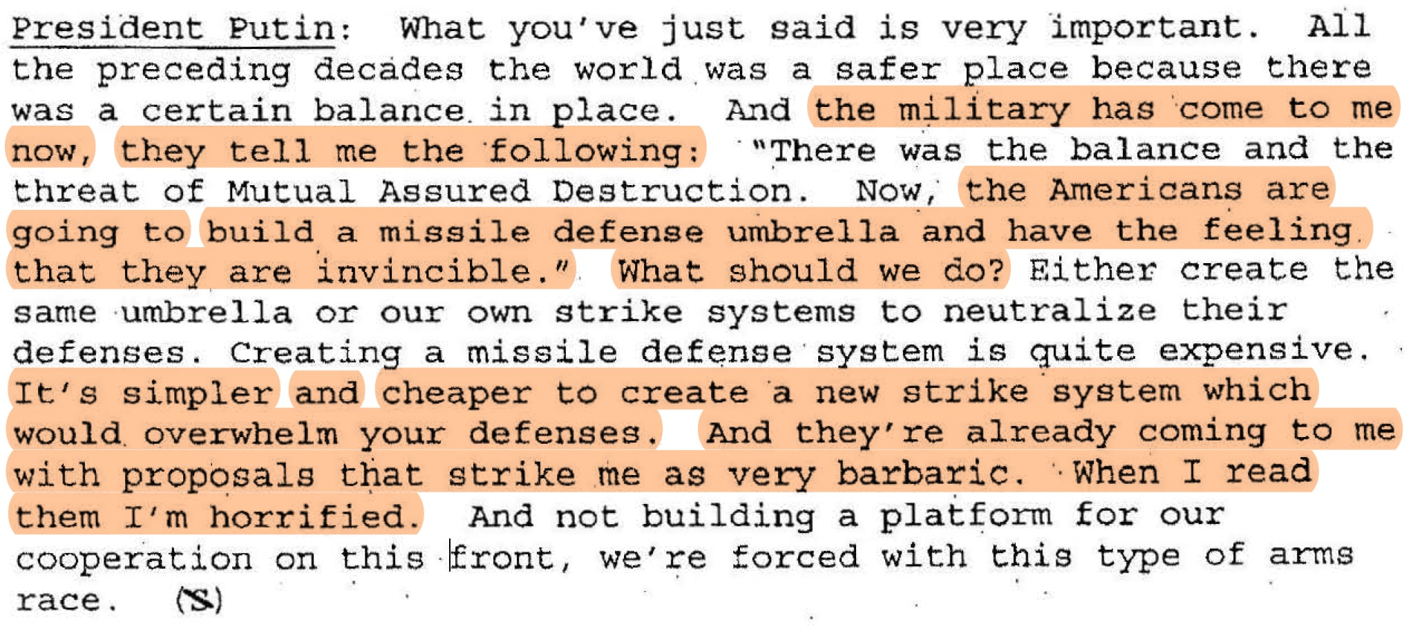 Putin: The military has come to me now, they tell me the following: “There was the balance and the threat of mutual assured destruction. Now, the Americans are going to build a missile defense umbrella and have the feeling that they are invincible.” What should we do? … It’s simpler and cheaper to create a new strike system which would overwhelm your defenses. And they’re already coming to me with proposals that strike me as very barbaric. When I read them I’m horrified.