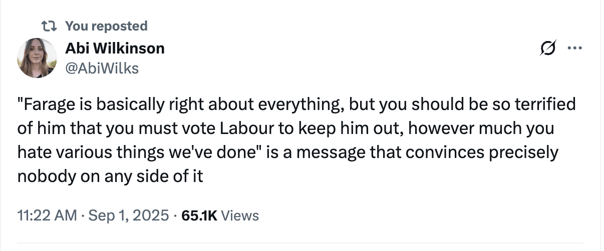 At a certain point, what was supposedly undertaken as a piece of political maneuvering becomes indistinguishable from political reality. On migrant rights, on transgender rights, on civil liberties, on the very idea of pluralism itself, the liberal steadily transforms into the post-liberal. Rhetorically, the far-right might remain a structuring bête noire against which all reasonable and democratically committed people must unite. But the actual points of distinction from it, such as they exist, are increasingly cosmetic and imaginary. Instead, it functions as a symbolic antagonist whose existence can quite literally be used to justify anything except actually voting for it.
