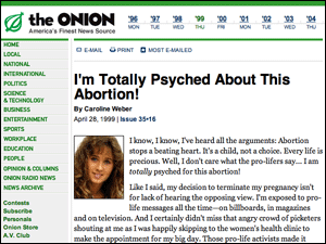 The proprietor of a pro-life blog railed with righteous indignation against a column from The Onion titled "I'm Totally Psyched About This Abortion!" Apparently lines from the column like "I seriously cannot wait for all the hemorrhaging and the uterine contractions" didn't tip the blogger off to the column's satirical intent--and he has since become the laughingstock of the blogosphere.